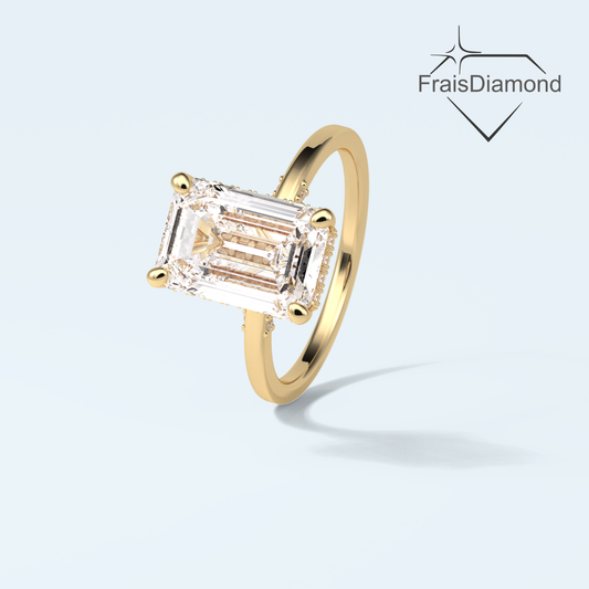 2.38 TCW Radiant Allure Emerald Cut Moissanite Hidden Halo Engagement Ring with Round cut Side Stones
